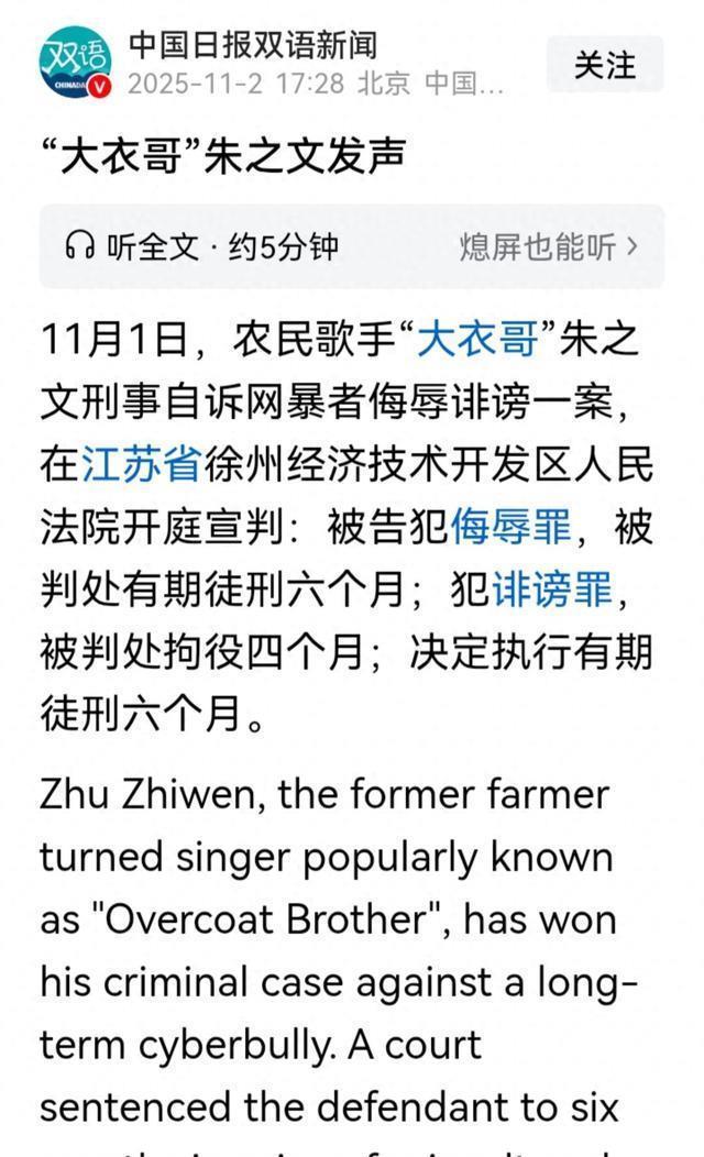 在信息爆炸的互联网时代,网络暴力如同一场无形的风暴,肆意侵袭着人们的生活;如同一颗颗社会毒瘤,危害社会和谐稳定。 近日,“大衣哥被网暴案”的宣判如同一记响亮的警钟,在网络世界中敲响,让人们再次深刻认识到网络暴力的危害以及法律对正义的守护。 案件回顾:“大衣哥”遭遇网络暴力风暴 2025年11月1日,“大衣哥”朱之文刑事自诉网暴者侮辱诽谤一案,在江苏省徐州经济技术开发区人民法院公开宣判。 被告人孙某某犯侮辱罪被判有期徒刑6个月,犯诽谤罪判处拘役4个月,朱之文表示对结果很满意,相信法律是公平公正的。
